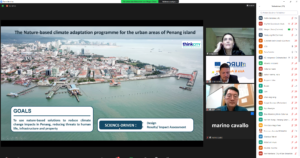 Sofia Castello, Lead of Environmental Resilience Community of Practice at Think City in Penang (Malaysia), introduced the comprehensive Climate Adaptation Programme (CAP) of Penang (the first of its kind in Malaysia) and shared examples of nature-based solutions to reduce climate change impacts. Due to the high increase of George Town’s temperature in the last 32 years (on average 1.5°C), Penang State has developed a comprehensive, science-based CAP based on NBS to reduce temperatures and flooding. The CAP has also developed special measures for vulnerable communities, institutional capacity building (including a knowledge management platform), and a disaster risk board. Ms Castello introduced the grants programme which is currently supporting 20 pilot projects for the cooperation with private owners. The main green infrastructure project is the street trees, which block the radiation from reaching the city hard surface, thus reducing the urban heat island effect by 2-6°C.