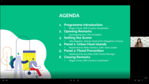 Over 80 representatives from IURC pilot cities in 20 countries participated in the 1st thematic webinar “Addressing Climate Change Effects in Cities”. The event focused on nature-based solutions (NBS) and green infrastructure measures implemented by cities in Europe, Asia and Australasia to mitigate heat island and heavy rainfall events. It was moderated by Megan Chow, Country Coordinator of the IURC team in Korea.
