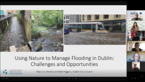 Mary-Liz Walshe and Neil Higgins, Dublin City Council (DCC) introduced challenges and opportunities to use nature-based solutions to manage flooding in Dublin (Ireland). Ms Walshe focused on the Camac River Flood Alleviation project, which aims at restoring the natural path of the river, which – centuries ago – was canalised through the city for power production, causing continuous flooding episodes. Under the water framework directive, DCC has developed a plan for re-naturalising the river corridor and a river catchment plan which may lead to keeping surface water at the surface to capture benefits to biodiversity and recreation, and reduce the pluvial flooding. Neil Higgins from DCC referred to the introduction of rain gardens into the streets of Dublin centre areas to capture and store rainwater, thus reducing flooding risks and increasing biodiversity. Dublin is attempting to introducing these measures to greening the city.