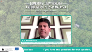 Ambassador Rokas stated that the EU committed to becoming the first climate-neutral continent by 2050 and recently presented a package of proposals (fit-for-55) to achieve the intermediary target of reducing GHG emissions in 2030 by 55% compared to 1990. The new European budget (2021-2027) has earmarked 600 billion EUR for green investment, with the European Investment Bank to supporting climate financing, he said. “The transition will be an engine for innovation, job creation, and a tremendous economic opportunity”, Ambassador Rokas said. He emphasised that the EU has set aside a record share of funding for international cooperation to achieving a fair and inclusive energy transition, including the most vulnerable people. Ambassador Rokas referred to the unique biodiversity of Malaysia and to the video produced “The EU and Malaysia: Let’s Green the World Together” that was shared at the online event.