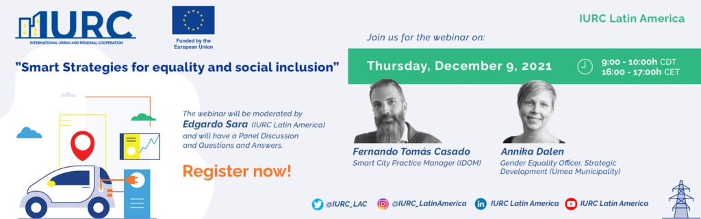 We are very pleased to invite you to join us for the webinar “Smart Strategies for Equality and Social Inclusion” organized by the International Urban and Regional Cooperation Latin America (IURC-LAC) Programme on Thursday, December 9th at 09:00 CDT/16:00 CEST. The webinar will have a duration of 1 hour.