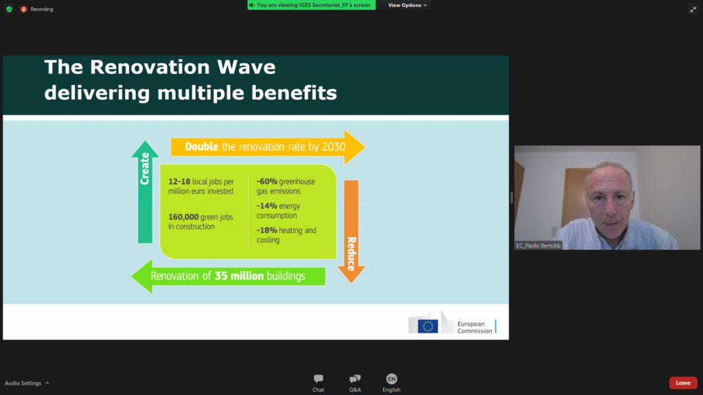 On 29 November 2021, IURC Asia & Australasia teamed up with the Institute for Global Environmental Strategies (IGES), which provides helpdesk service to paired EU and Japanese cities in the programme, to organise a webinar titled “The Role of Municipalities in Promoting the Renovation Wave” as part of the International Forum for Sustainable Asia and the Pacific 2021 (ISAP2021). The session featured four main speakers, who shared information on EU policies for renovation of existing buildings as well as experiences from cities in this regard. It was moderated by Ms. Ryoko Nakano, the Research Manager of City Taskforce at IGES. Mr. Hidefumi Imura, Professor Emeritus at Nagoya University and Senior Fellow at IGES, provided a background to the webinar. Meanwhile, Mr. Pablo Gándara, Team Leader of IURC Asia & Australasia, engaged the speakers in discussions and gave information on the next steps for thematic cross-country cooperation.