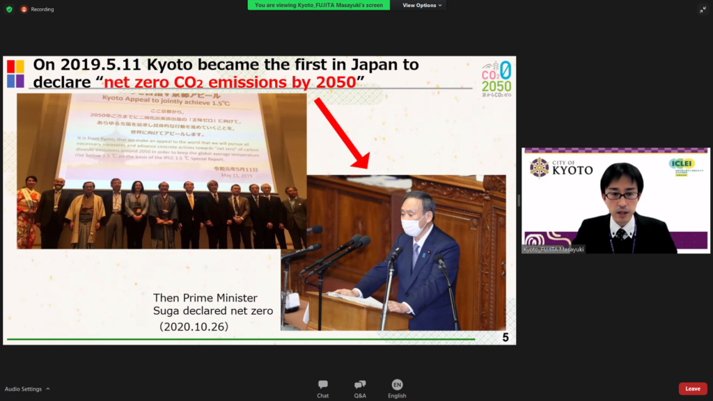On 11 May 2019, the Mayor of Kyoto became the first in Japan to declare “net zero CO2 emissions by 2050”. Then, Prime Minister Suga declared the net zero goal on 26 October 2020. Currently, 479 municipalities in Japan declared to achieve carbon neutrality by 2050. According to the Kyoto City’s Building Policies for New Constructions and Extensions, a large building with a total floor area of 2,000 m2 and beyond is obligated to install renewable power generators with an obligatory volume of 30GJ and use locally produced timber. Meanwhile, the city’s Measures to Promote Renewable Energy in New Buildings, Constructions, Extensions and Retrofits will from 2022 increase obligations for large buildings, changing from a fixed volume (30GJ) to calculation by meter (60-450GJ) and put obligations on mid-size buildings to install renewable power generators with an obligatory volume of 30GJ. In addition, there is a scheme for a joint purchase of solar PVs and other measures to encourage the spread of solar PVs to homes.