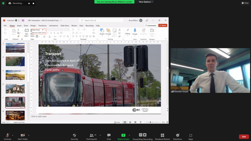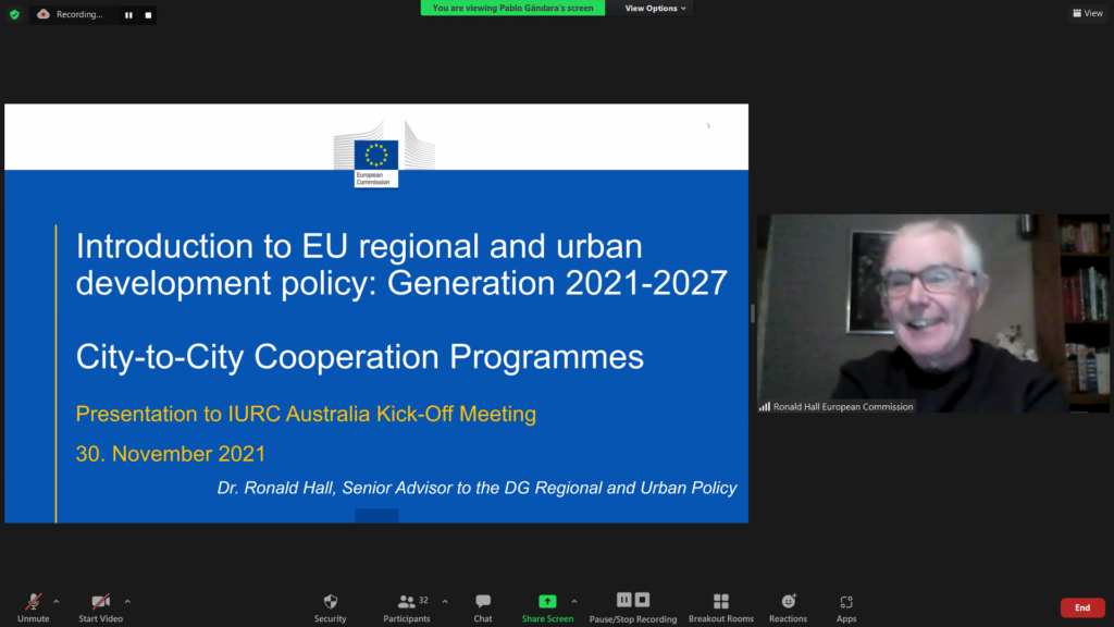 Dr. Ronald Hall, Senior Advisor to the Directorate-General for Urban and Regional Policy (DG REGIO), provided an overview of EU policy on urban development and cooperation and the budgets the European Commission has set aside for the Multiannual Financial Framework 2021-2027 and the NextGenerationEU economic recovery plan to promote sustainable urban development (SUD). He also noted the wealth of experience Australian cities had brought into the EU-funded World Cities programme between 2017 and 2018. Dr. Hall also introduced the cooperation approach within the IURC programme and emphasized the importance of quick identification of thematic priorities in the coming months to prepare the study visits and follow-up pilot actions.