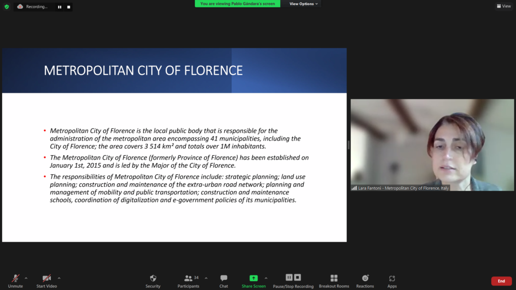 At the launch, the four EU cities had the opportunity to introduce themselves first, starting with Florence. Representing the Metropolitan City of Florence, Ms. Lara Fantoni cited three thematic areas that the city wants to have cooperation on: 1) mobility and transport, 2) tourism and culture and 3) circular economy. The whole metropolitan area has over 1 million inhabitants and millions of visitors visit Florence each year. Therefore, mobility is a big challenge. The city has implemented several projects to promote public means of transport, including the development of tramway systems, the creation of Bus Rapid Transit (BRT) lines, increasing bicycle and pedestrian accessibility, and applying ITS technology to achieve smart mobility. Ms. Fantoni explained the potential for cooperation in the areas of tourism and culture, and showcased some a digital tools to support sustainable tourism.