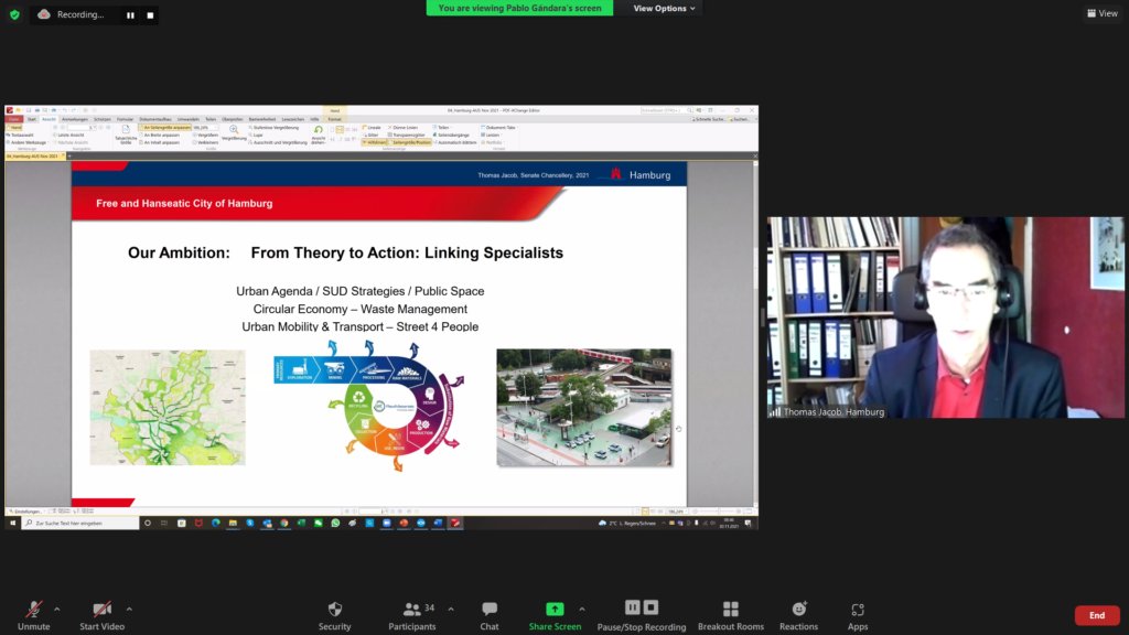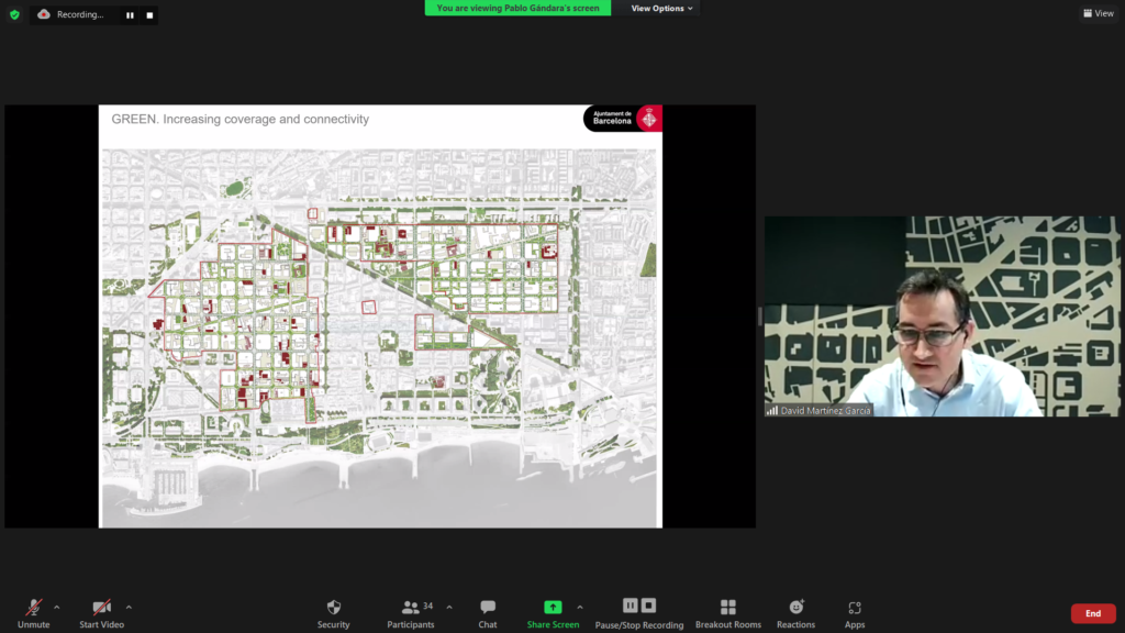 Next up was Barcelona. Mr. David Martínez, Director of the Municipal Institute of Urbanism, gave a broad presentation on Barcelona and its current economic and urban development strategies. He referred to the Barcelona Green Deal and to the urban regeneration programmes in areas like the Besos river. Sustainable mobility concepts like the Superblock help to increase coverage and connectivity, he said. Mr. Martínez shared few examples of drainage system improvement as well as of reducing energy consumption in the city. “Retrofitting building stock built from the 60s is a key challenge” he said. Mr Martínez shared with the audience the urban transformation pathway of Barcelona’s Pobleneu, which has become 22@barcelona, a landmark for urban innovation and “quadruple helix” cooperation between with public authorities, academia, civil society and business partners.