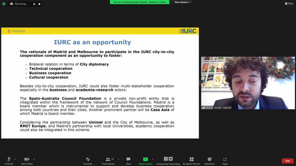 The last EU city to present was Madrid, represented by Mr. Nicolas Gharbi from the International Affairs and City Diplomacy department. In the IUC programme, Madrid was paired with Buenos Aires. Also, it recently had cooperation with Melbourne to develop technical, academic and diplomatic cooperation links. For IURC, Madrid is mainly interested in nature-based solutions, with a focus on urban forests, while mobility is another potential cooperation area, which Madrid will be happy to work in a cluster with other cities. Madrid is developing a metropolitan forest to mitigate urban heat island effects and improve biodiversity, air pollution, social cohesion and the quality of life. Mr Gharbi emphasized that Madrid city is open to identify further thematic priorities for the cooperation with the Australian cities.