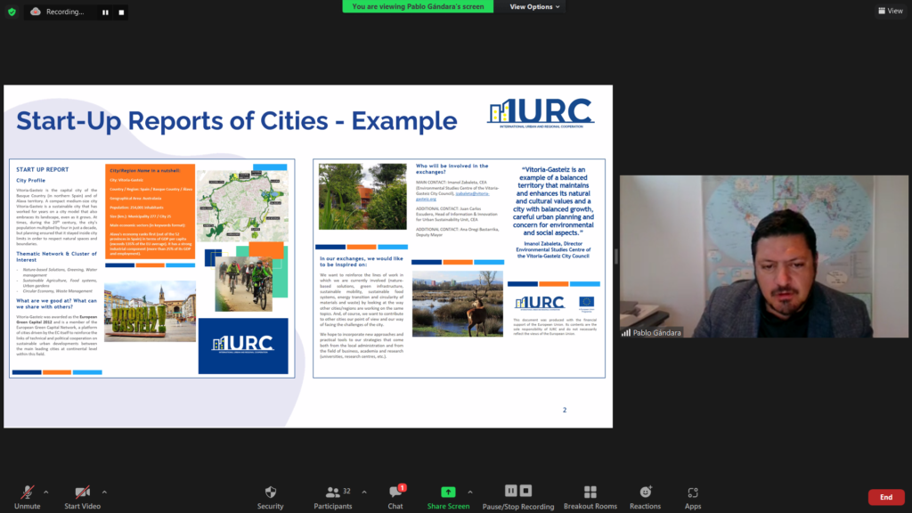 Mr. Pablo Gándara, IURC Team Leader, referred to the upcoming activities for the seven EU and Australian cities including a join thematic matchmaking mid-December and monthly bilateral follow-up meetings from mid-February 2022 onwards. He also referred to the cross-country thematic cooperation which includes a webinar on innovation clusters and precincts in February 2022. The project team will support pilot cities in elaborating Start-Up Reports including their single thematic priorities, relevant best practices and involved experts.