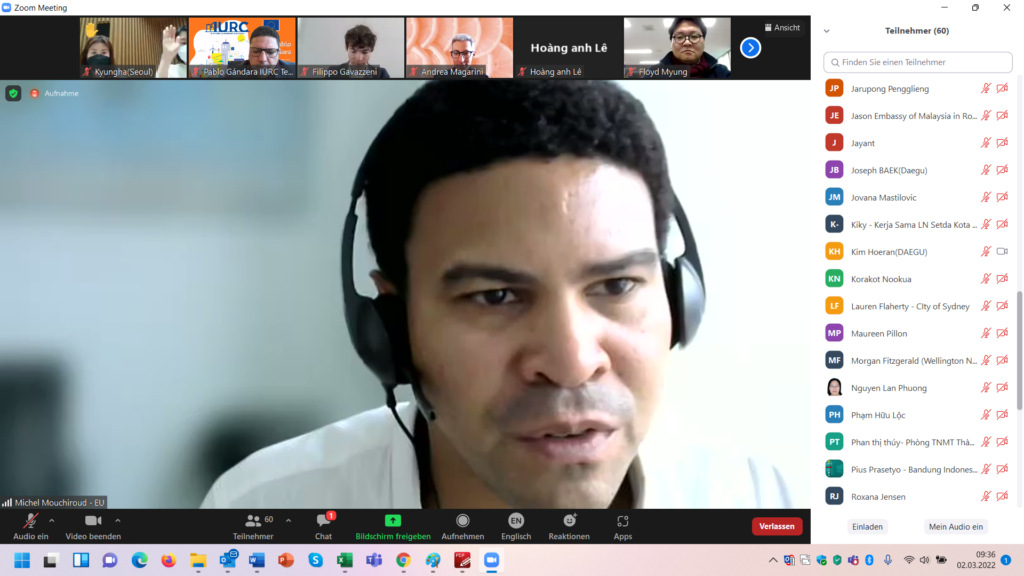 As an introductory session, the launch event on 2 March 2022 provided information on the work of both the MUFPP and IURC and stressed the importance of developing sustainable food systems. Moderated by Mr. Pablo Gándara, Team Leader of IURC Asia & Australasia, the event welcomed Mr. Michel Mouchiroud, Deputy Head, EU Foreign Policy Instruments Asia-Pacific, who highlighted how having fair, healthy, and environmentally friendly food systems could reduce greenhouse gas emissions and improve the management of natural resources as part of the European Green Deal. He was very keen to work with MUFPP and participating cities to promote urban food policies and find a way to make the food system more sustainable. As a final statement, he was looking forward to the upcoming webinar series that would inspire other cities. From the European Union’s perspective, he hoped the exchange would encourage the development of food policies in a more sustainable way.