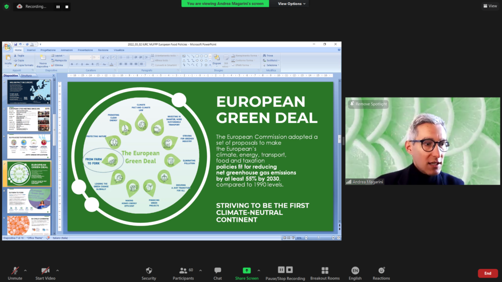 Mr. Magarini continued the presentation with the introduction of five different urban food projects funded by the European Union, engaging policymakers and researchers. They were 1) Food Trails, 2) Food Shift 2030, 3) Fusilli, 4) Cities 2030, and 5) FoodE. To close the presentation, he briefly introduced the Food Trails project, which aimed to translate the MUFPP’s shared vision and collective commitment to integrated urban food policies into measurable and long-term progress towards sustainable food systems in Europe.