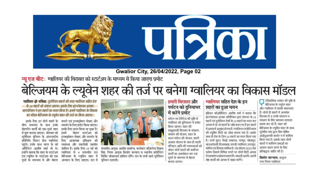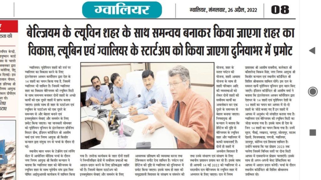 Representatives from Gwalior, Leuven and IURC met on 25 April 2022 in Gwalior to promote the cooperation on business incubator support and plan the exchange visit of 4 delegates from Gwalior to Leuven between 16-19 May 2022. Mr Geert Robberechts, Director of India House Leuven, visited the city to conduct a preliminary assessment of the incubator services. He met with the Municipal Commissioner and District Collector to discuss further details of the cooperation and to brainstorm on how best to exchange best practices in terms of policy, pilot intervention, training and mentoring.