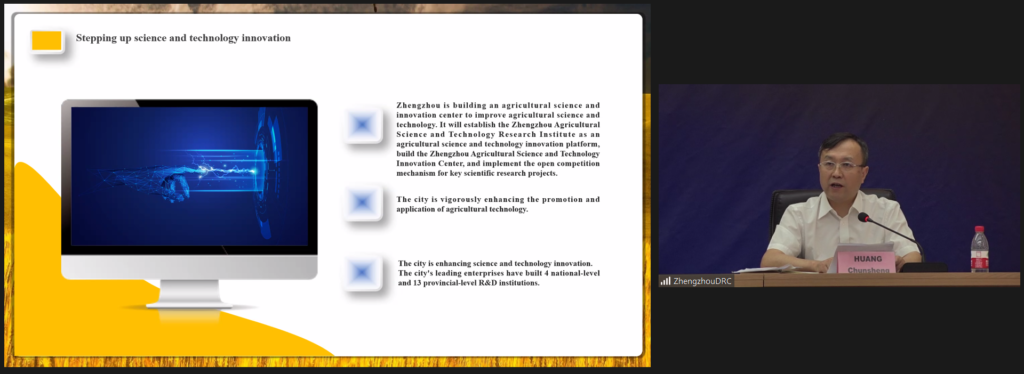 Mr. HUANG Chunsheng from Zhengzhou Municipal Agriculture Committee presented Zhengzhou´s strategies for sustainable and circular agriculture development, and modernisation and innovation in rural areas. He highlighted Zhengzhou´s endeavour in the efficiency of fertilizers and pesticides, pollution control and plant protection, organic farming enhancement, straw waste circulation and related knowledge transfer in research & innovation and education & training.
