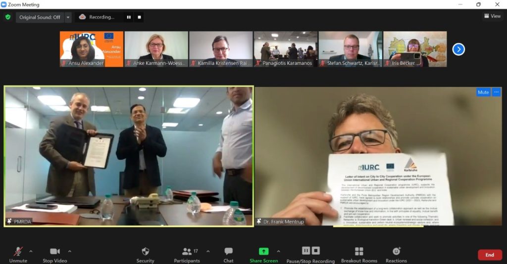 The EU-funded International Urban and Regional Cooperation (IURC) Programme, the Pune Metropolitan Region Development Authority (PMRDA), Maharashtra, India, and the City of Karlsruhe, Germany, have signed three Memorandums of Understanding (MoUs) at PMRDA Office on 31st May 2022 to build relationships and promote concrete cooperation on sustainable urban development and innovation from 2021-2023.