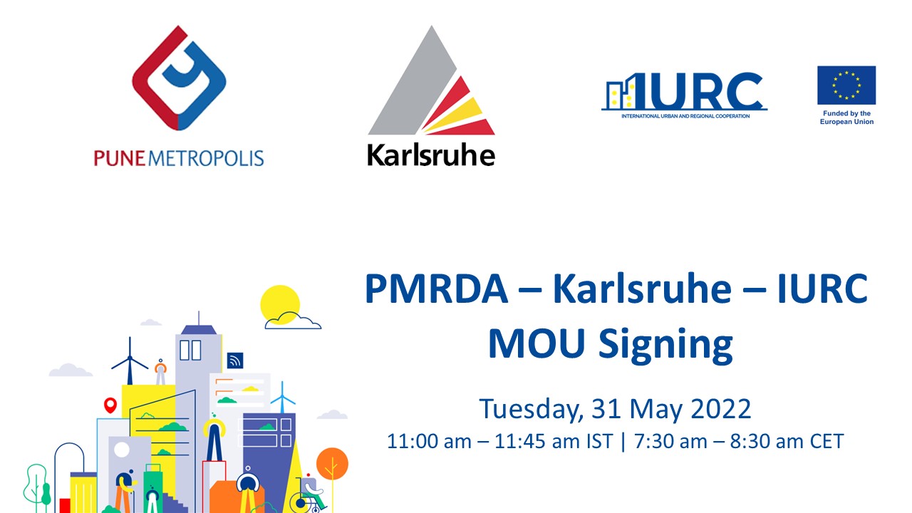 The EU-funded International Urban and Regional Cooperation (IURC) Programme, the Pune Metropolitan Region Development Authority (PMRDA), Maharashtra, India, and the City of Karlsruhe, Germany, have signed three Memorandums of Understanding (MoUs) at PMRDA Office on 31st May 2022 to build relationships and promote concrete cooperation on sustainable urban development and innovation from 2021-2023.