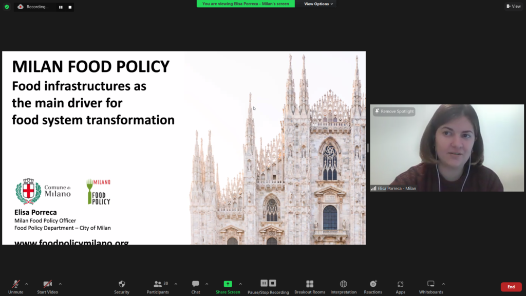Elisa Porreca, Food Policy Officer of the City of Milan, gave a presentation titled “Food Infrastructure as the Main Driver for Food System Transformation”, showcasing several infrastructural entities in Milan’s food system and highlighting different partnerships that help the city ensure food accessibility, prevent food losses and food waste, and reduce the environmental impact. For example, the school canteen programme includes 658 canteens and 24 kitchen centers. By reducing the purchasing of red meat, GHG emissions has lowered by around 20% from 2015 to 2019.