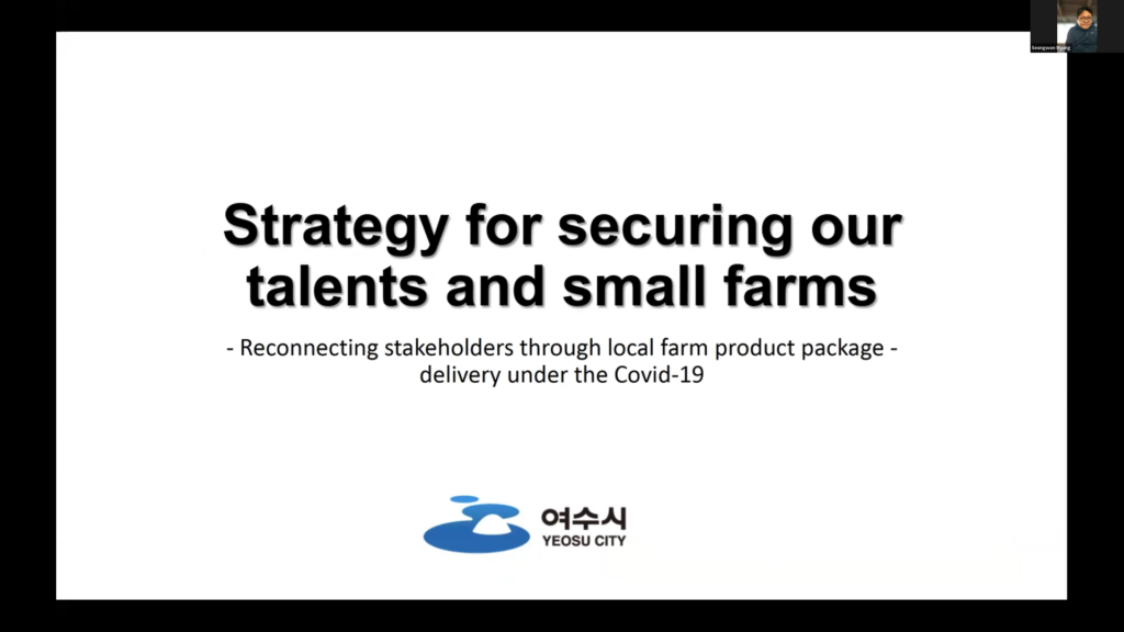 Last but not least, Seongwon Myung, International Relations Officer from the City of Yeosu, gave a presentation titled “Strategy for Securing Talents and Small Farms”. This programme reconnects the stakeholders in the school meal programme under the COVID-19 situation.