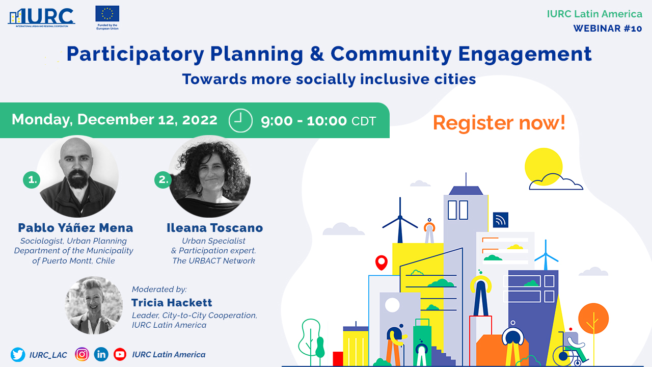 We are very pleased to invite you to join us for the “Participatory Planning & Community Engagement: Towards More Socially Inclusive Cities” webinar. The event is organized by the International Urban and Regional Cooperation Latin America (IURC-LAC) Programme on Monday, December 12th at 09:00 CDT/16:00 CEST. The webinar will have a duration of 60 minutes and offer simultaneous interpretation in English, Spanish, and Portuguese.