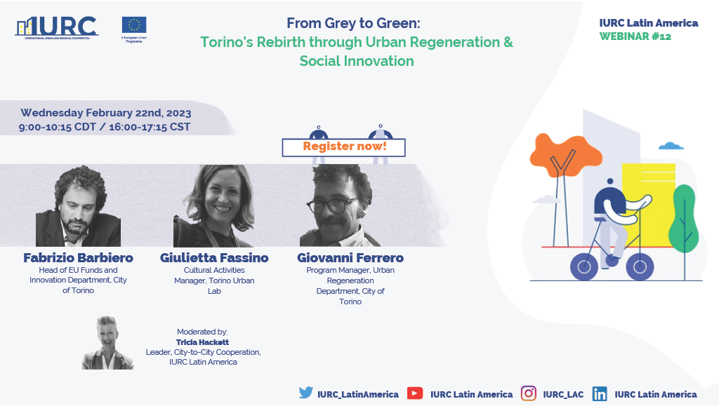 We are very pleased to invite you to join us for the “From Grey to Green: Torino’s Rebirth through Urban Regeneration & Social Innovation” webinar. The event is organized by the International Urban and Regional Cooperation Latin America (IURC-LAC) Programme on Wednesday, February 22nd at 09:00 CDT/16:00 CEST. The webinar will have a duration of 75 minutes and offer simultaneous interpretation in English, Spanish, and Portuguese.