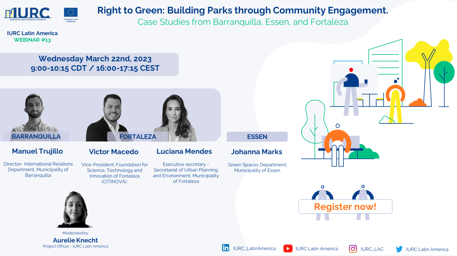 We are very pleased to invite you to join us for the webinar “Right to Green: Building Parks through Community Engagement. Case Studies from Barranquilla, Essen, and Fortaleza”. The event is organized by the International Urban and Regional Cooperation Latin America (IURC-LAC) Programme on Wednesday, March 22nd at 09:00 CDT/16:00 CST. The webinar will have a duration of 75 minutes and offer simultaneous interpretation in English, Spanish, and Portuguese.
