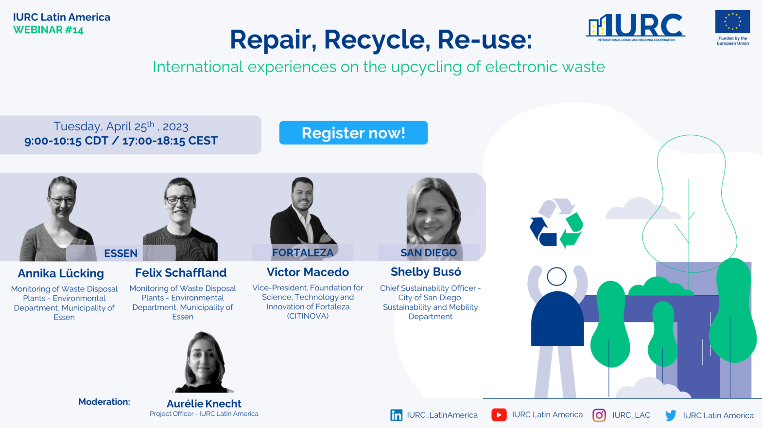We are very pleased to invite you to join us for the webinar “Repair, Recycle, Re-use: International experiences on the upcycling of electronic waste”. The event is organized by the International Urban and Regional Cooperation Latin America (IURC-LAC) Programme on Tuesday, April 25th at 09:00 CDT/ 17:00 CEST. The webinar will have a duration of 75 minutes and offer simultaneous interpretation in English, Spanish, and Portuguese.