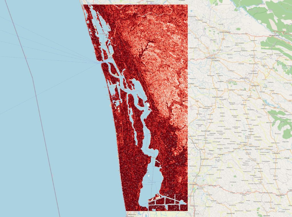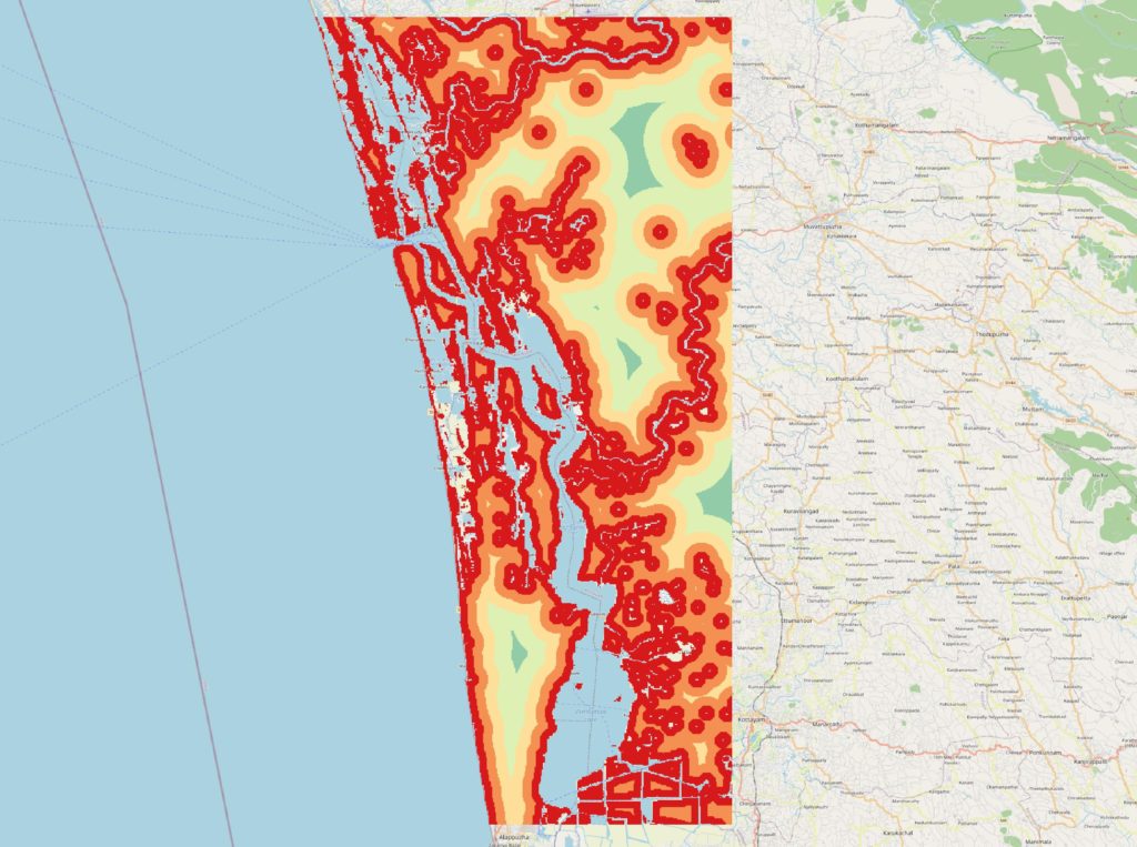 The results of the cooperation led to the development of a flood-risk map for Kochi with the use of open-source data. The flood risk map shows on a scale from 0-20 the areas of Kochi that are prone to flooding. It is obvious that a large part of the city, especially close to the coast is subject to high risk of flooding. This information is useful for policy makers and urban planners to better understand areas that require more attention in terms of mitigation and adaptation measures, enabling emergency providers to assist with higher priority cases. Furthermore, the map can be used to identify appropriate location for the pilot or extensive installation of surface water level sensors that can be used as early-warning systems. Based on the cooperation with IURC, the TOSCA team further developed concepts and ideas for building a flood module for Kochi that will enable a predictive early-warning flood system for the city of Kochi.