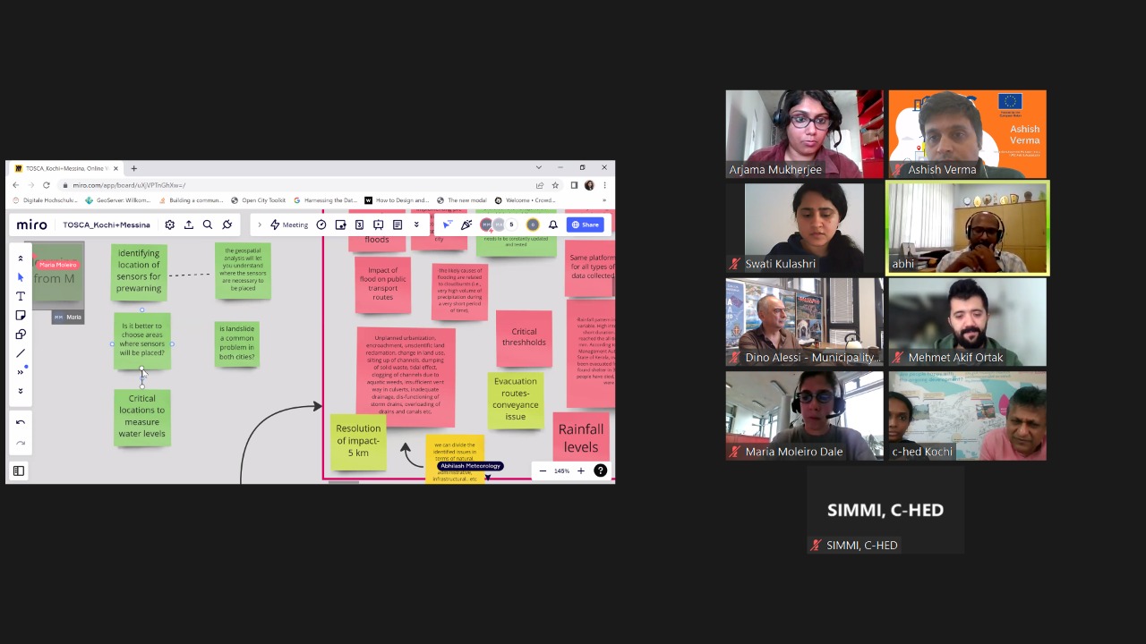 In 2022 and 2023, as part of the Toolkit for Open Sustainable City Planning and Analysis (TOSCA), a minimal viable use case on flooding was developed for the city of Kochi in India by the Digital City Science team at Hafen City University (HCU). Coordinated by IURC, other partners included Kochi Municipal Corporation, Municipality of Messina, Centre for Heritage, Environment and Development in Kochi, University of Messina, and Cochin University of Science and Technology. The objective of the use-case was to showcase how available data can provide useful information about flooding in Kochi. It started with a kick-off workshop to collect user demands and several follow-up sessions that were documented using a miro-board. Several communications also took place in between.
