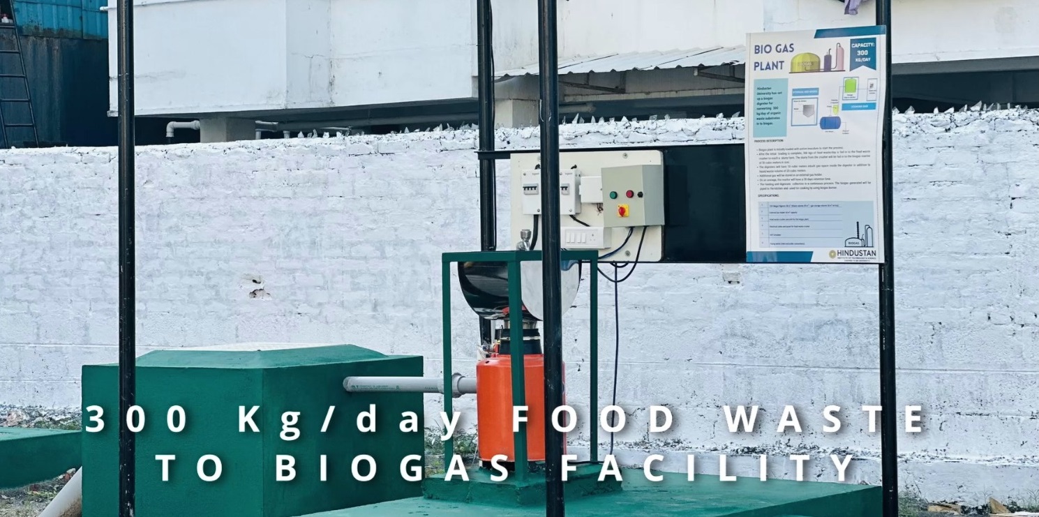 A biogas plant is a facility that converts organic waste materials into biogas through a natural process called anaerobic digestion. This renewable energy technology utilizes microorganisms to break down organic matter, such as agricultural residues, food scraps, and animal manure, in the absence of oxygen. As the organic material decomposes, it produces methane-rich biogas, which can be used as a clean and sustainable source of energy for cooking, heating, and electricity generation. Additionally, the residual slurry left after the digestion process can be used as a nutrient-rich fertilizer. Biogas plants contribute to waste management, reduce greenhouse gas emissions, and promote the production of renewable energy in an environmentally friendly manner. The pilot plant handles 300 kg/day food waste produced within the campus premises, while the output is used for cooking. The plant comprises of the following components: