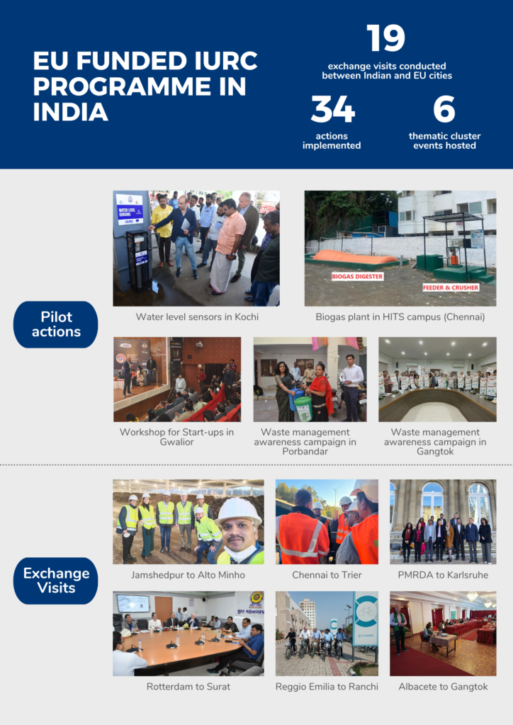 The International Urban and Regional Cooperation (IURC) Programme was formally launched in India in February 2022 and worked with 14 Indian cities and 9 European cities, through 9 city pairings and five single cities. The programme focused on exchange of best practices, thematic cluster workshops, exchange visits, bi-lateral meetings, etc. For three city pairings it was possible to design and implement demonstration projects as part of the Competitive Fund initiative. The topics of cooperation ranged from flood management, solid waste management, non-motorised transport, to smart parking, business innovation – support for start-ups, circular economy, and sustainable urban planning.