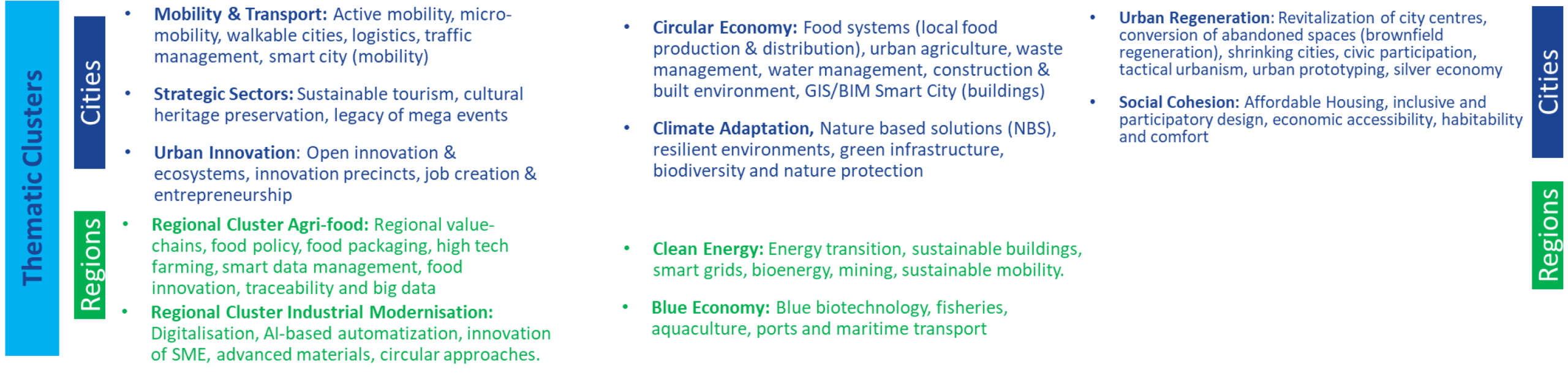 As Sandra Marin, Knowledge Management Expert, explained, there are seven thematic clusters for cities (Mobility & Transport, Strategic Sectors, Urban Innovation, Circular Economy, Climate Adaptation, Urban Regeneration, and Social Cohesion) and four clusters for regions (Agri-food, Industrial Modernisation, Clean Energy, and Blue Economy). Sandra also introduced the city-to-city component, while Silke Haarich elaborated on the region-to-region component. These clusters form the foundation for cross-continental Communities of Practice, where participating local governments will share challenges, exchange best practices, and jointly shape pilot projects with high visibility and impact.