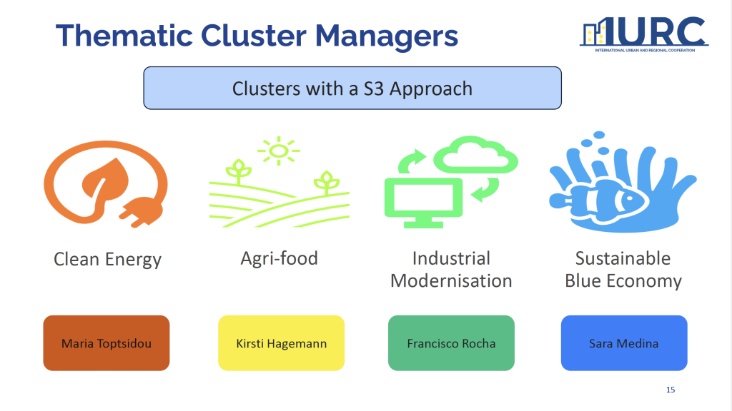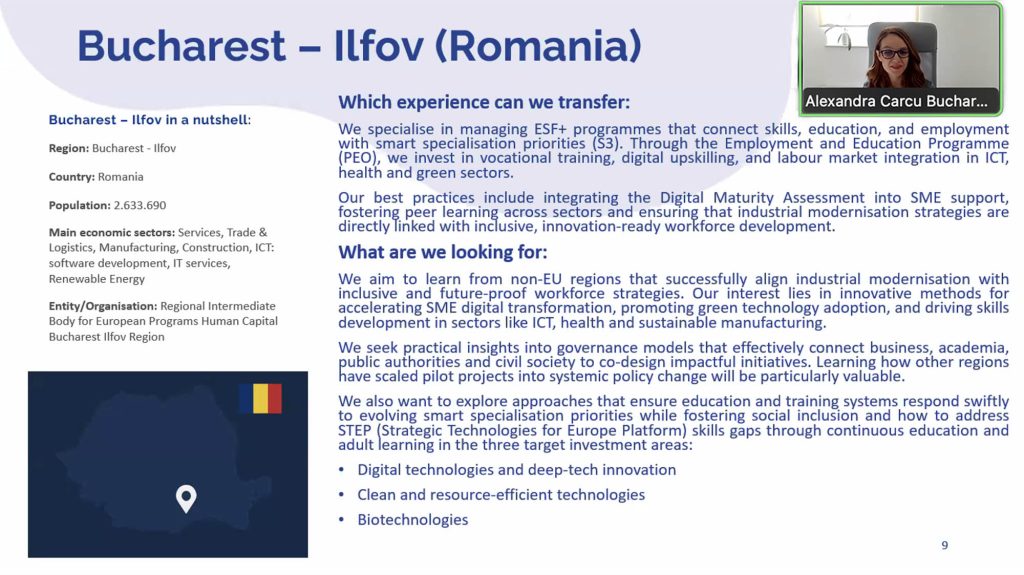 Francisco Rocha, IURC Regional Cluster Manager, presented the thematic cluster of Industrial Modernization and their S3 strategies to modernise their industry base through and in collaboration with other regions, regarding Green Transition, Global Competitiveness and Digital Transition. Alexandra Carcu of the Regional Intermediate Body for European Programs, Bucharest, Romania, complemented the discussion by sharing initiatives on SME digital upskilling, workforce development, and green technology adoption. Waste management innovation was elaborated by Rui Rodrigues of LIPOR, showcasing advanced prevention and training solutions.