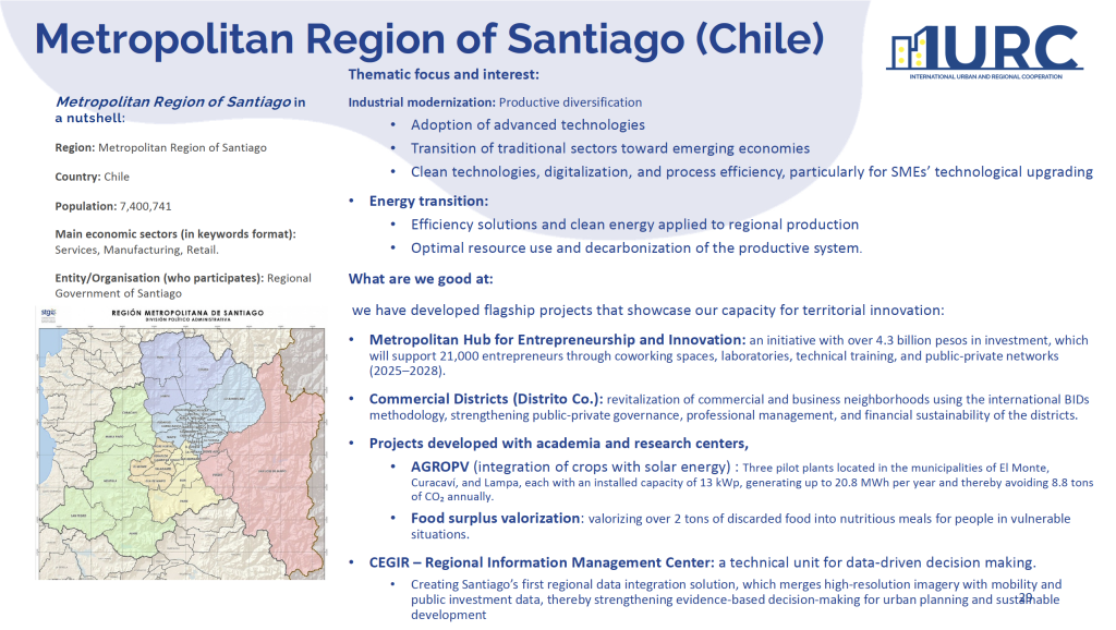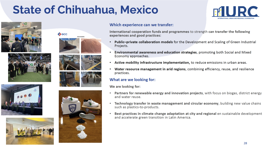Industrial symbiosis was highlighted by Victor Gómez-Céspedes of Chihuahua, Mexico and Abraham Redekop, Energy Agency of the State of Chihuahua, who demonstrated how their platform connects companies to optimize energy and resources. Fernando Court, Head of Economic Development, Regional Garden of Santiago, focused on territorial innovation and SME support, emphasizing energy transitions and inclusive ecosystems.
