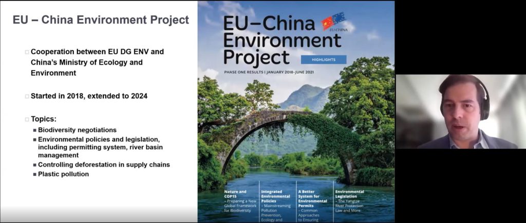 Mr. Huw Slater, the Key Expert of the EU-China Environment Project and the Lead Climate Specialist of ICF, talked about the challenges and opportunities of China’s green transition and its implication for the European business. In China´s pathways of ecological modernisation and 30/60 decarbonisation, many sectors are developing rapidly, including green growth in industry, agriculture, infrastructure and services. He highlighted the opportunities for EU business in the fields of low carbon energy engineering and components, engineering and mechanical design, recycling processes and technologies, energy storage, biofuels, and services, e.g., facilities management, legal and financial advisory.