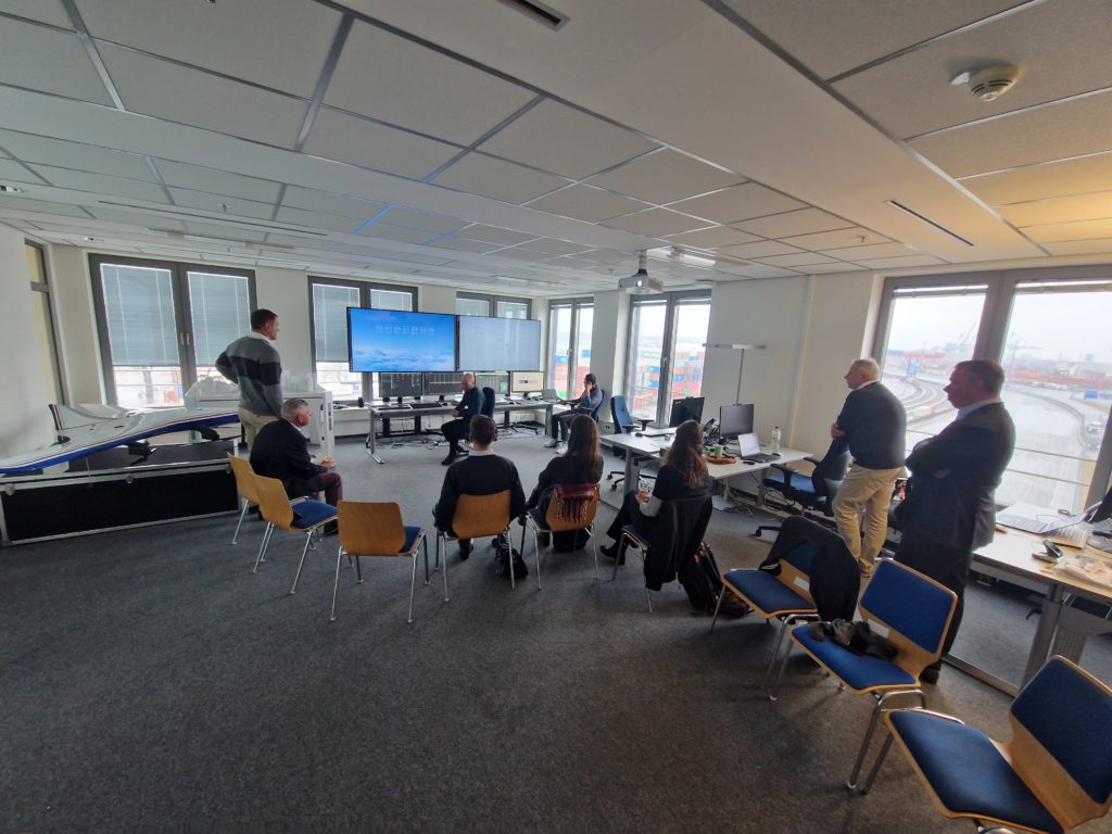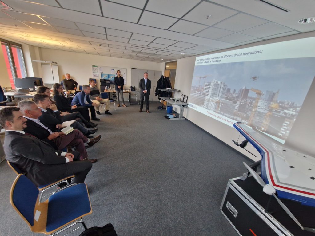 The first site visit was to the port for a presentation by HHLA Sky – a start-up of HHLA – which is focused on the use of drones for maintenance surveillance, traffic management, security surveillance, fire operations and potentially more areas. HHLA Sky is predominantly a software developer, generating new systems with drones to reduce costs, increase safety and support more efficient operations. They have the capacity to run a control centre for the port area. Apart from operating a small number of zones, they are actively engaged in the preparations for the regulation of drone use in the port area. By using drones for the monitoring of infrastructure, cities can reduce up to 72% of the time and up to 90% of the usual resources. Discussions centred on the U-Space regulatory framework for unmanned aircraft traffic management, which has been released by the European Commission, as compared with the Australian regulatory context.