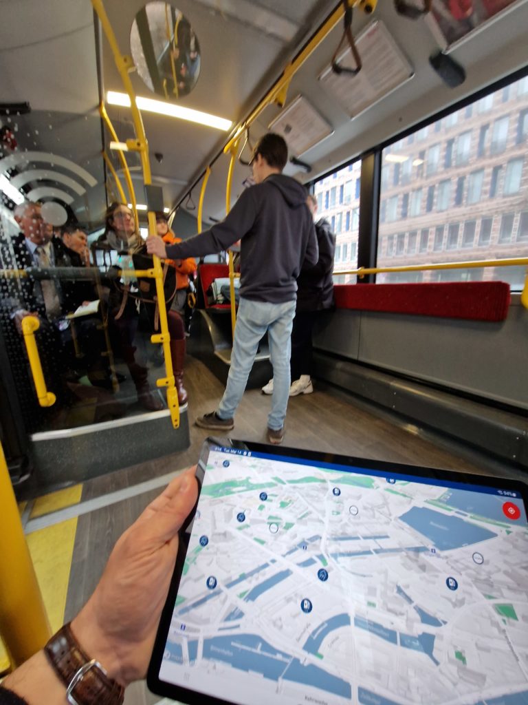 A team from New Mobility Solutions Hamburg guided delegates around a number of sites to illustrate some of the 250 new mobility projects underway in the city. The tour was done in an electric bus equipped with mobile intelligent transportation systems to interact with infrastructure (i.e. traffic lights) and with other vehicles. There was mention of an automated parking valet system, as an example of digital mobile solutions that can add to liveability. These solutions can be developed on an open innovation platform. A highlight was the visit to the switch station demonstrating intermodal opportunities from train, to bus, to ride share, to e-scooters, e-bikes, share EVs all at the one site. They are preparing for autonomous vehicles as there will not be enough drivers.