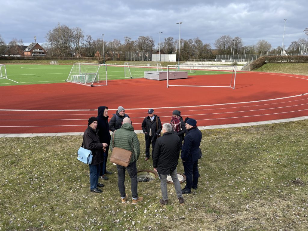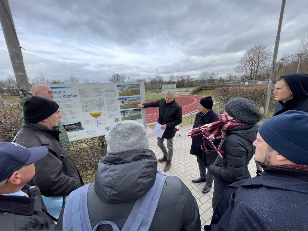 Colleagues from Borough Hamburg-Mitte led a site-visit to water-holding sports field. This was designed so that there was a significant tank underneath the playing field where excess water could be drained. It had the effect of alleviating flooding pressures in houses and community facilities. It has been a collaborative project with a number of stakeholders. The concept could be applied elsewhere but the topographical context would need to be similar.