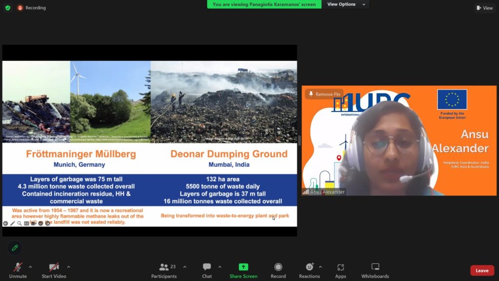 As part of the IURC thematic network ?Ecological Transition & Green Deal?, on 25th September 2023, IURC AA (India) delivered the thematic event Legacy Waste Biomining: Challenges & Solutions. The aim was to share best practices on how to manage legacy waste. Officials from Panaji, Leh, Jamshedpur, Patna, Porbandar, Gangtok, Kochi, Chennai, Trier, Messina and the Greek Cities of Trikala, Farkadona & Meteora attended this 2-hour interactive event.