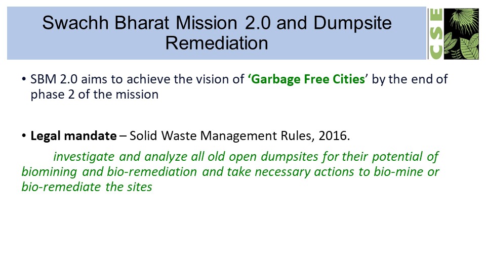 Dr. Singh detailed out the process of biomining along with the current status of landfills/dumpsites, composition of legacy waste, different methods of remediation, considerations during legacy waste processing, etc. The expert presented the machinery used in biomining, considerations during gainful application of recovered legacy waste and common challenges. The case studies of Ajith Singh Nagar in Vijayawada, Atladara in Vadodara and Bhanpur Khanti in Bhopal showcased how best practices in landfill mining contributes to sustainable development. Dr. Singh also mentioned the release of Toolkit: Legacy Waste Management and Dumpsite Remediation to Support Swachh Bharat Mission 2.0 in 2022, and Methane Emissions from Open Dumpsites in India in 2023,  which are directly relevant to this topic.
