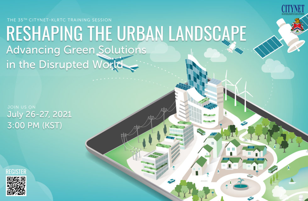 CityNet and Kuala Lumpur Regional Training Centre (KLRTC) are organizing the 35th KLRTC Training Session on July 26-27, 2021 at 3 PM (KST). With the theme, ?Reshaping the Urban Landscape: Advancing Green Solutions in the Disrupted World?, the online exclusive session will convene a select number of city experts to jointly reflect on the urban sustainability trends, generate insights, and test learning tools to improving different decision-making processes for post-pandemic recovery.