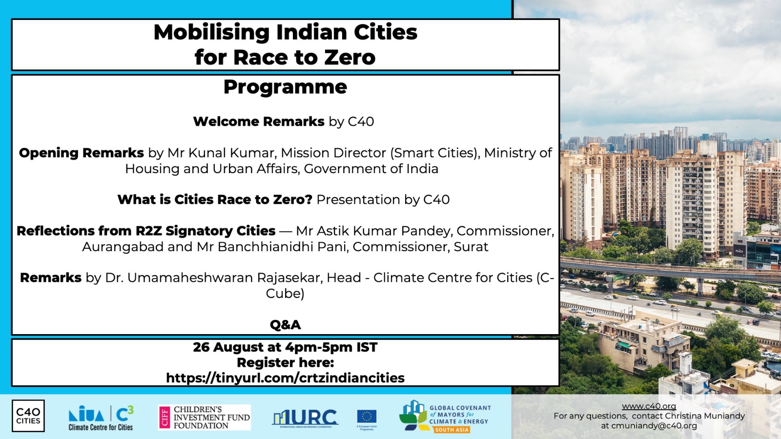 Organised part of the cooperation between the C40 Cities Climate Leadership Group, the International Urban and Regional Cooperation programme (IURC), the South Asian chapter of the Global Covenant of Mayors, and the National Institute of Urban Affairs in India, the Mobilising Indian Cities for Race to Zero webinar encouraged Indian cities to join the global pledge to achieve net-zero GHG emissions and build an inclusive, sustainable and resilient future for all.