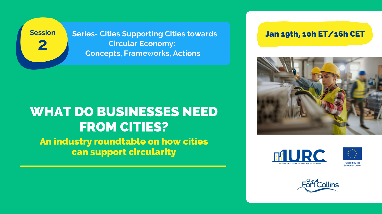 In this second session of the IURC-NA Cities Supporting Cities Towards a Circular Economy series: participants will learn how policies, interventions, and strategies from the city government can support industrial manufacturing operations to implement circular business practices. During this interactive session, participants will get the opportunity to ask questions to representatives from several leading companies and better understand what cities can do to support more circular business practices.