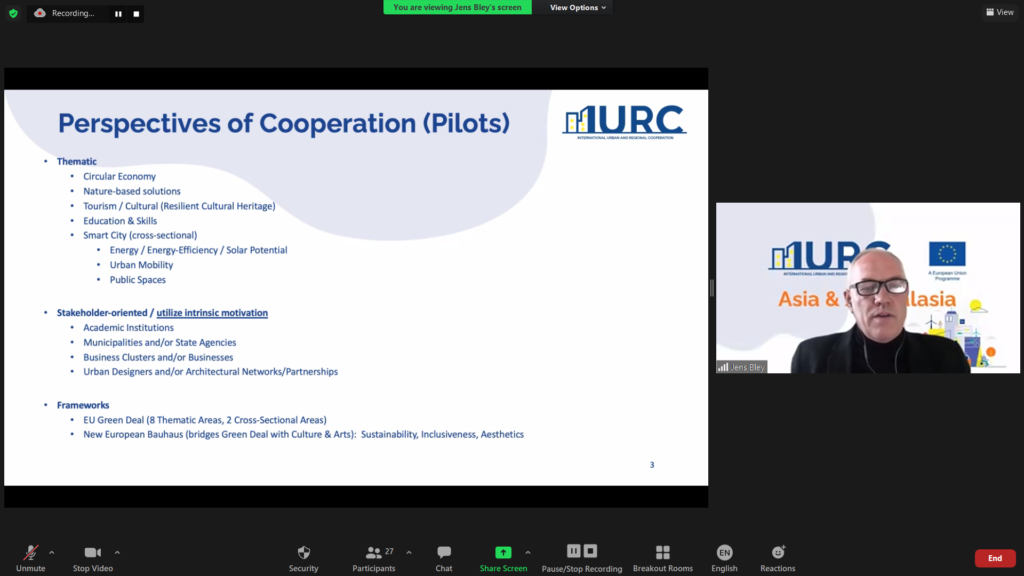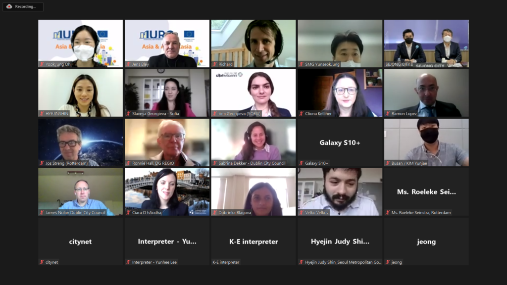 Within the current programme, Rotterdam will cooperate with Busan, Dublin with Seoul, and Sofia with Sejong. Check out their presentations below to see what exciting projects could potentially result from their cooperation. Pablo Gándara, who leads the IURC, team introduced the project objectives and the approach to cooperation based on two tracks: the bilateral one between EU and Korean cities, and the thematic one with regional city clusters dealing in areas like green infrastructure, energy transition, mobility and circular economy among few others. He also stated that EU and Korean cities will be enabled to work beyond one-to-one city pairings by promoting cross-city cooperation among the six cities. Jens Bley, smartcity expert from the IURC team, focused on methodologies to create a quadruple helix approach in the IURC cooperation and provided a few examples from the IUC project. The meeting was moderated by Megan Chow, IURC country coordinator, and Yookyung Oh from CityNet, who explained the next steps for the cooperation.
