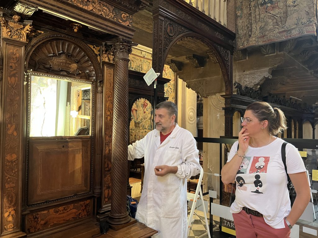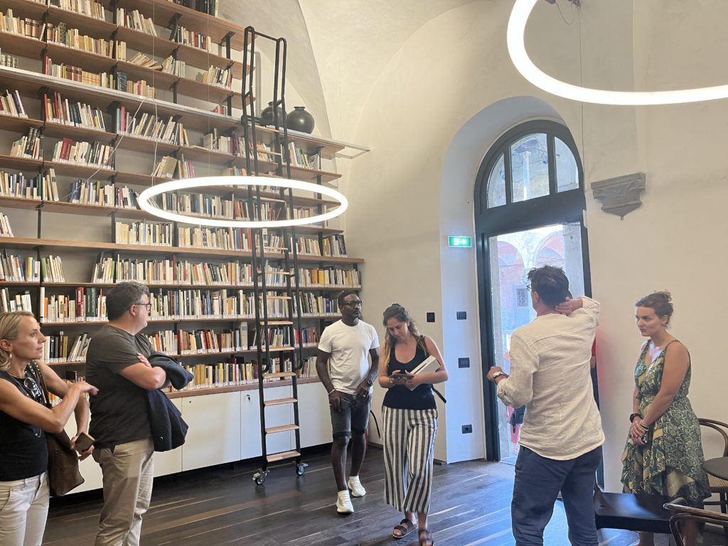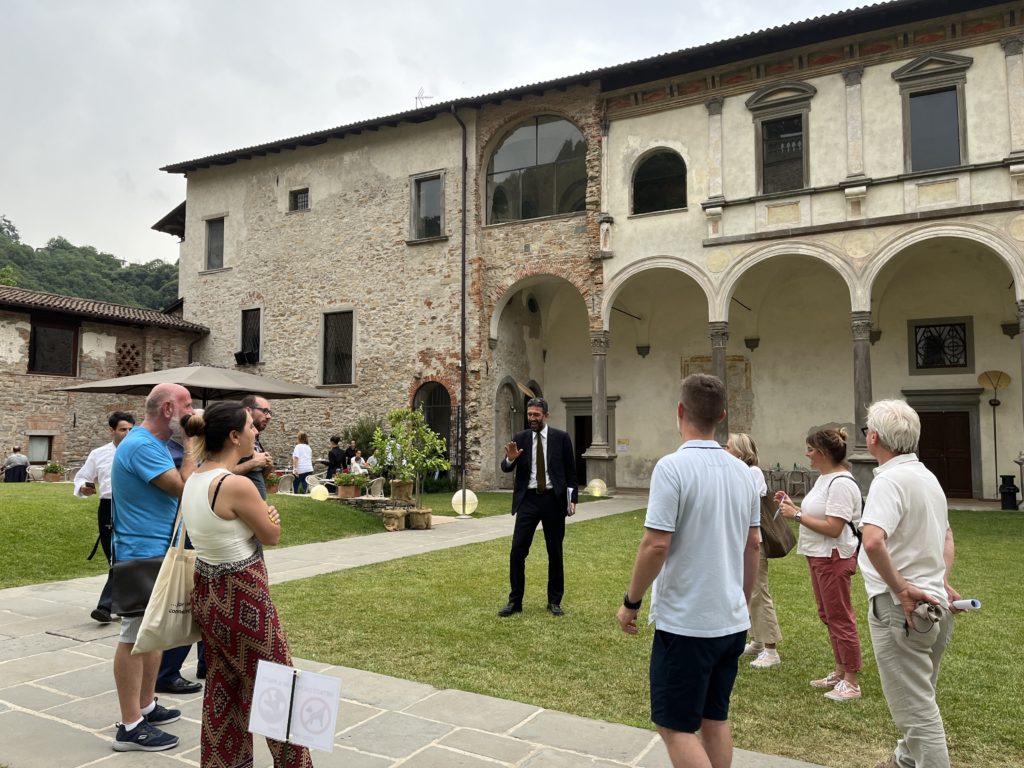 The group continued to Palazzo Morroni, which, in partnership with Fondo Ambiente Italiano (FAI), has resulted in the transformation of a private home (2009) into a museum (2020). The third stop was the church of Santa Maria Maggiore, owned by the City and managed and maintained by the MIA Foundation. The partnership ensures that the church is restored and preserved. The final stop was at the site of the Monastero del Carmine, a regeneration project supported by the city of Bergamo in partnership with Teatro Tascabile Bergamo. The building owned by the city was abandoned for 70 years and is now a thriving theater venue. These projects intend to make culture the starting point and to use its power to renovate historical buildings.