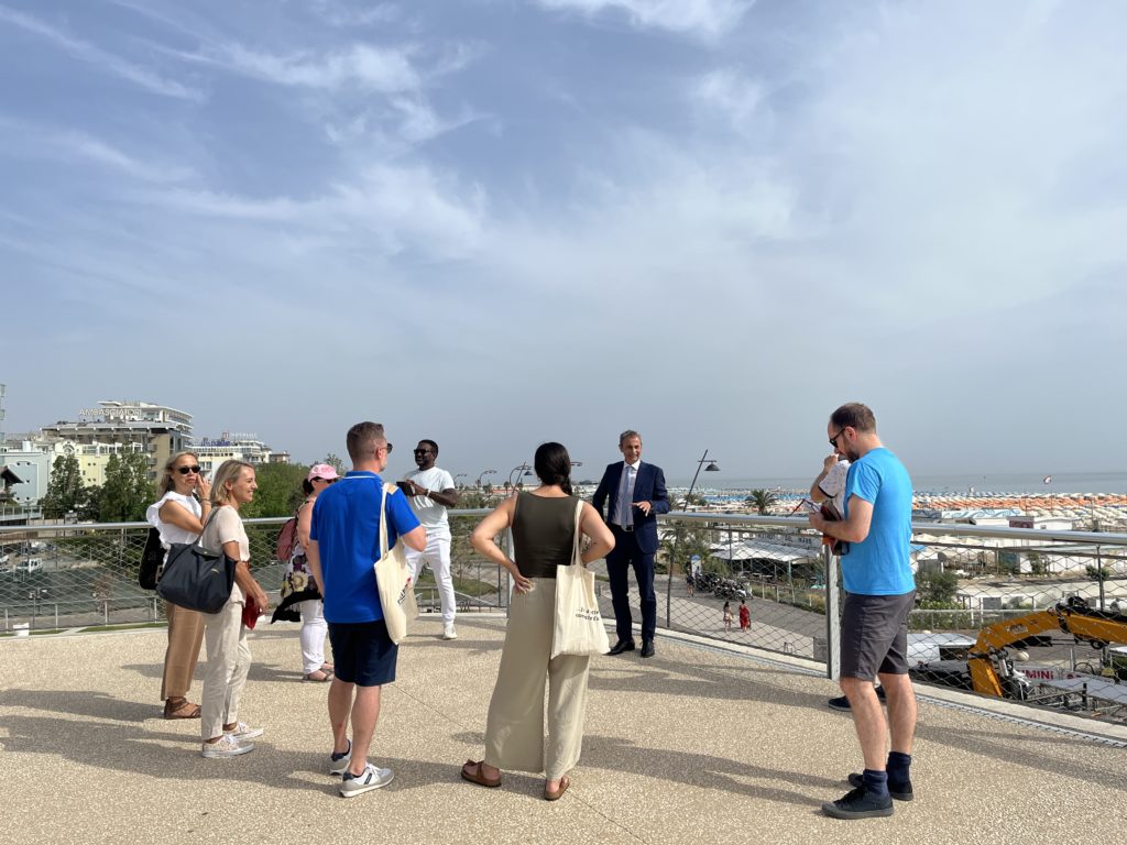 On the first day in Rimini, the group visited the Optimized Bathing Safeguard Plan (PSBO), which consists of a sewage reclamation project to solve the problem of discharges into the sea, thus providing an overall solution to the critical issue of bathing in contaminated water. With a total value of 154 million euros, the new plant in the redeveloped boardwalk is not only a building with a complex mechanical system, but it was designed to become an iconic public space and viewpoint. The partnership between Gruppo Hera and Romagna Acque has turned Rimini into the first coastal city in Italy to implement the Optimized Bathing Safeguard Plan and to design the plant as a public space.