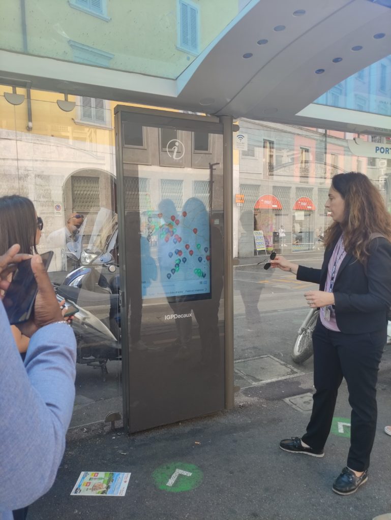 The first field visit was to a Smart Bus Stop, which shows the time left for the bus to arrive and the available seats. This display empowers users to decide if they want to board the arriving bus or wait for a less crowded one. The bus stop also works as a smart kiosk, showing points of interest, bike-sharing stations, and info from the ATB and Bergamo.