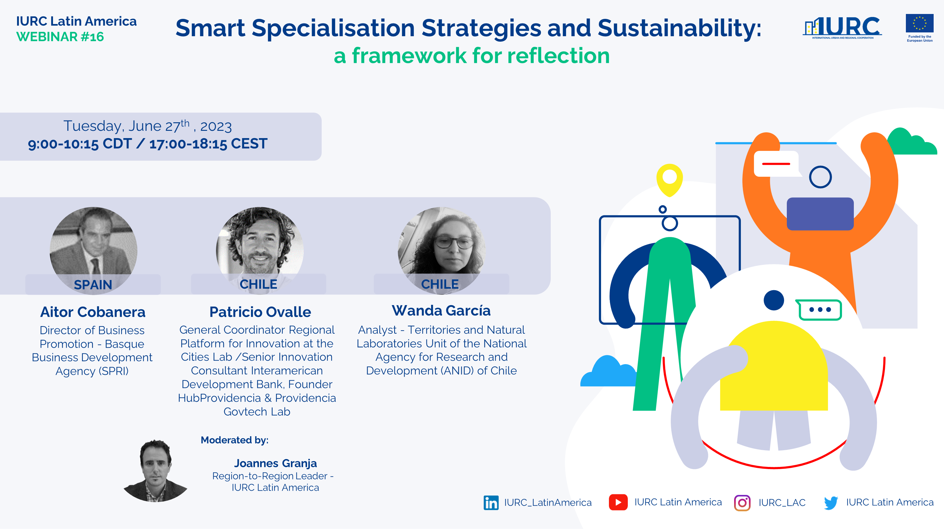 The webinar “Smart Specialization Strategies and Sustainability” organized by the International Urban and Regional Cooperation Latin America (IURC-LAC) Programme sougth to show reflections related to the sustainability dimension of smart specialisation strategies and their deployment in the industrial (industrial policies and sustainability) and local (entrepreneurship and innovation Hubs) dimensions. The presentations aimed to generate inspiration on how to mobilise research and innovation to address the SDGs in various territorial contexts, including places facing institutional and structural challenges. The framework is based on an inclusive approach to thinking about innovation and innovation policy, seeing them as central to fostering the transition to sustainability in all territories. It also delves into the concept and importance of regenerative design and platform design in the context of Smart Specialisation Strategies.