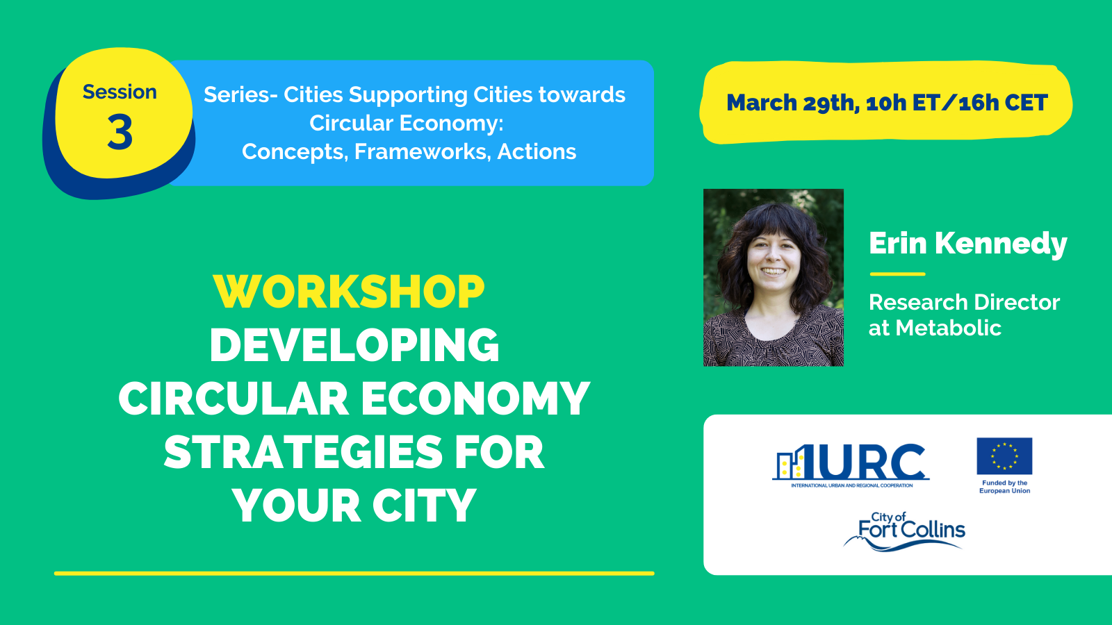In this interactive workshop, Circular Economy Expert Erin Kennedy from Metabolic ? a Netherlands-based organization who has over a decade of experience advising businesses, governments, and nonprofits around the world on how to thrive in a circular economy ? will offer practical advice and strategies to help cities develop and implement their circular economy plans.