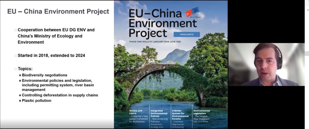 中欧环境合作项目主要专家、ICF首席气候专家休-斯莱特(Huw Slater)先生就中国绿色转型的挑战与机遇及其对中欧经贸合作的影响发表主旨演讲。他指出,在达成中国生态现代化以及30/60双碳目标的道路上,许多行业正在迅速发展,其中包括工业、农业、基础设施和服务的绿色发展。他强调了欧洲企业在低碳能源工程和设备、工程和机械设计、资源循环利用技术、能源储存、生物质燃料,以及其它服务领域如运营管理、法律和绿色金融等方面的机会。