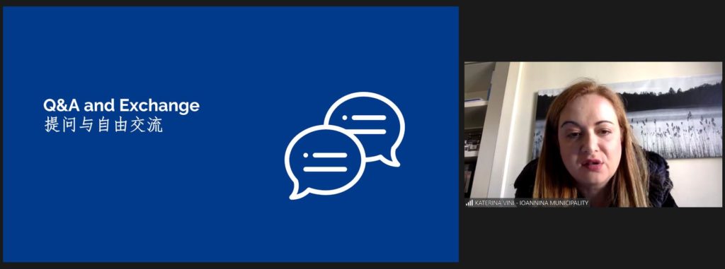 在讨论环节,各城市分享了提高复原力、生产力和宜居性的路线图和合作建议。例如,约阿尼纳强调了公共交通、智能自行车共享骑行系统和节能建筑以达到气候中和;苏州则重点关注城市规划、交通设计和能源规划方面的知识转移。