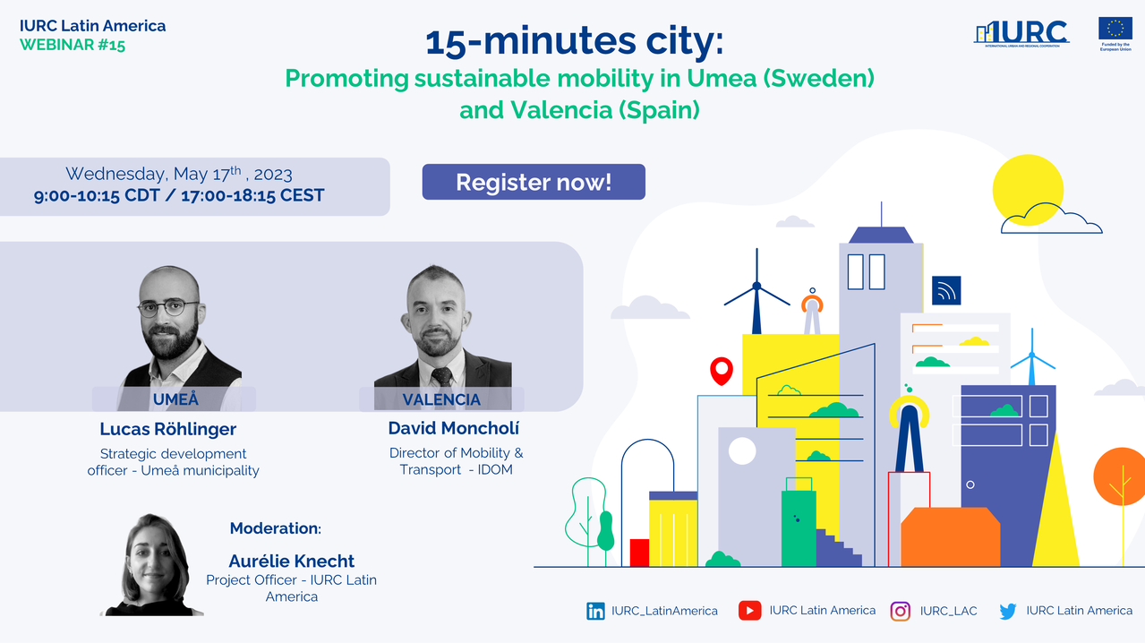 We are very pleased to invite you to join us for the webinar “15-minutes city: promoting sustainable mobility in Umea (Sweden) and Valencia (Spain)?. The event is organized by the International Urban and Regional Cooperation Latin America (IURC-LAC) Programme on Wednesday, May 17th at 09:00 CDT/17:00 CST. The webinar will have a duration of 75 minutes and offer simultaneous interpretation in English, Spanish, and Portuguese.
